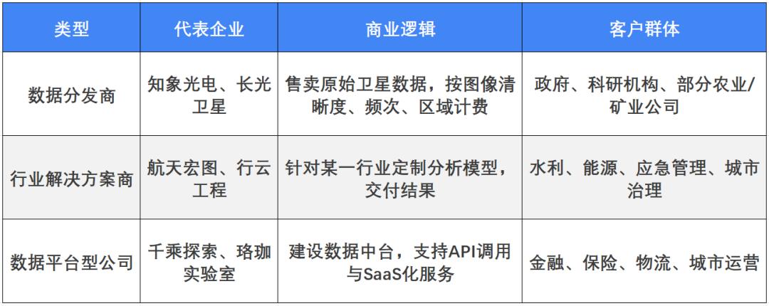 代表如天仪研究院(兼具小卫星与数据平台能力)、航天宏图(遥感数据与地理信息服务)、观测者网(商业遥感平台),它们不自研火箭、不大规模造星,而是将已有的航天数据能力包装为B端解决方案,服务于农业、能源、物流、应急等场景。