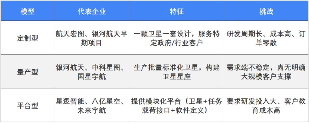 据氪睿研究整理,当前中国的卫星制造企业可划分为三类模型: