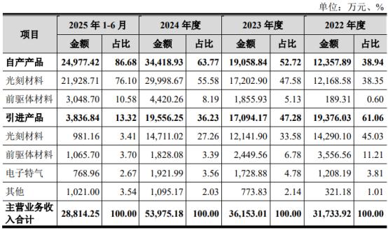 具体来看,2022年至2025年上半年,恒坤新材自产产品销售收入分别约为 1.2亿元、1.9亿元、3.4亿元和 2.4亿元,占主营业务收入的比例分别为 38.94%、52.72%、63.77%和 86.68%,收入规模和占比逐年上升。