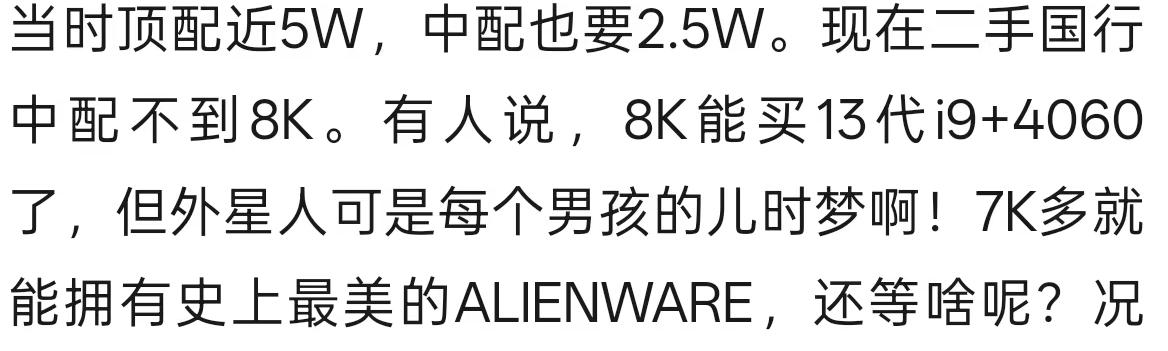 为什么这种推荐会这么多?原因其实很简单:二手数码特别适合拿来讲“故事”,一台外星人旗舰,首先拿出来就有噱头,然后再加上‘当年旗舰、信仰灯、顶级做工’等话术,最后再来个“现在只要三千多,比当年便宜一大半”,小白立刻觉得自己捡到宝。