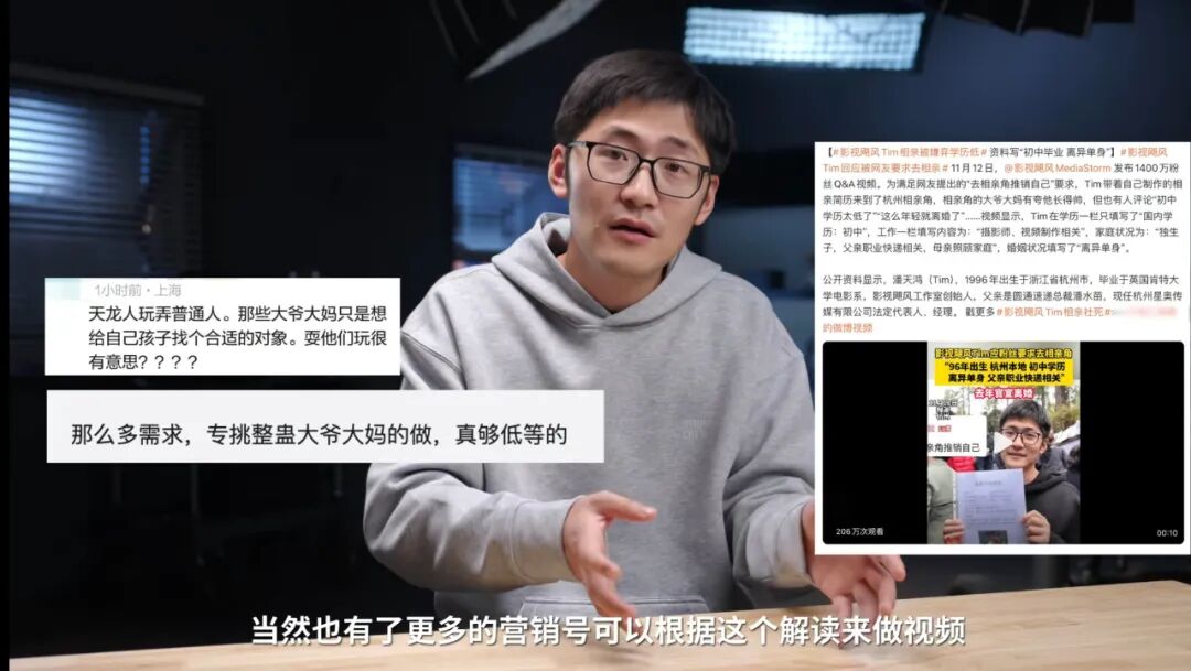 面对最近几天网上的争议,影视飓风Tim在最新视频中这样回应近期的相亲角风波。