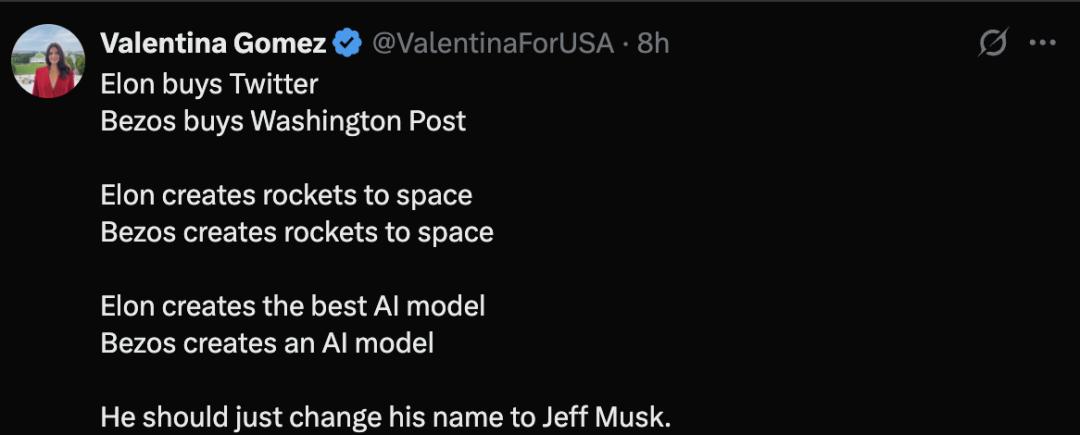 网友Valentina Gomez「建议」贝索斯应该改姓马,改名叫杰夫·马斯克: