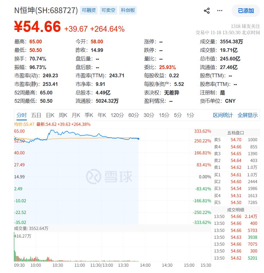 上市首日,恒坤新材开盘价为58元/股,截至下午13时50分,恒坤新材股价报54.66元/股,较发行价涨264.64%,总市值245.60亿元。