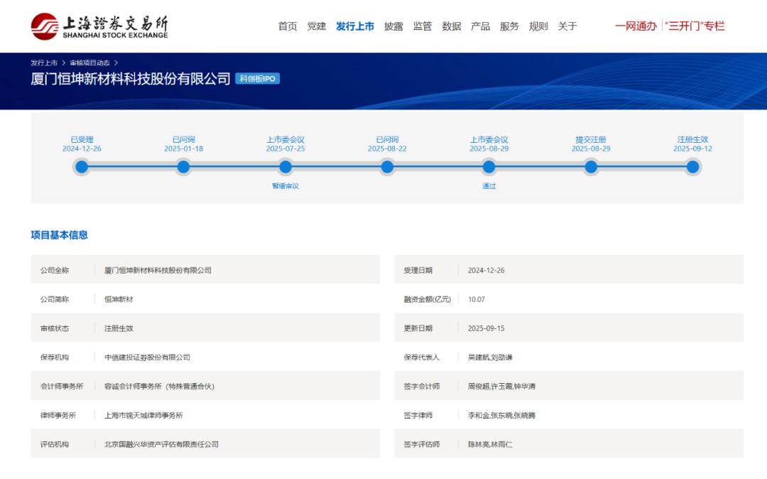 恒坤新材科创板IPO于2024年12月26日获受理,尽管在2025年初次上会时被暂缓审议,但恒坤新材从受理到挂牌整个流程也只用了不到一年时间。
