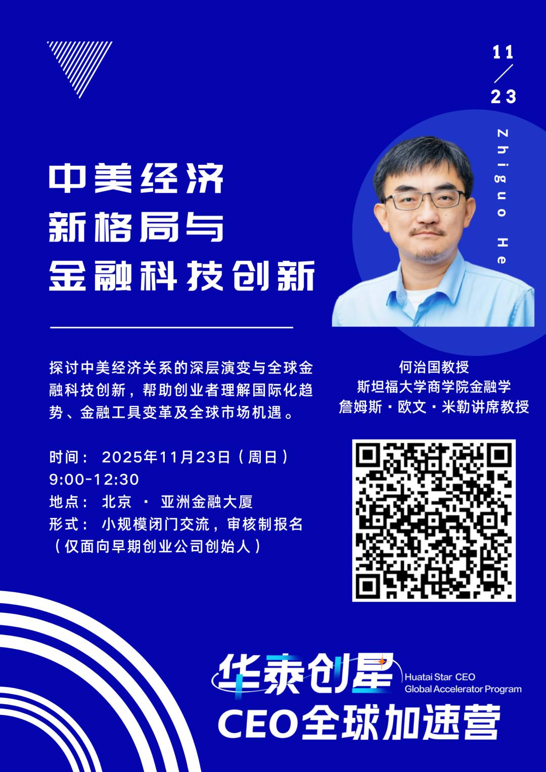 2025年11月23日(周日)上午,华泰创星CEO全球加速营特别邀请斯坦福大学商学院金融学教授何治国(Zhiguo He)带来主题分享——《中美经济新格局与金融科技创新》。