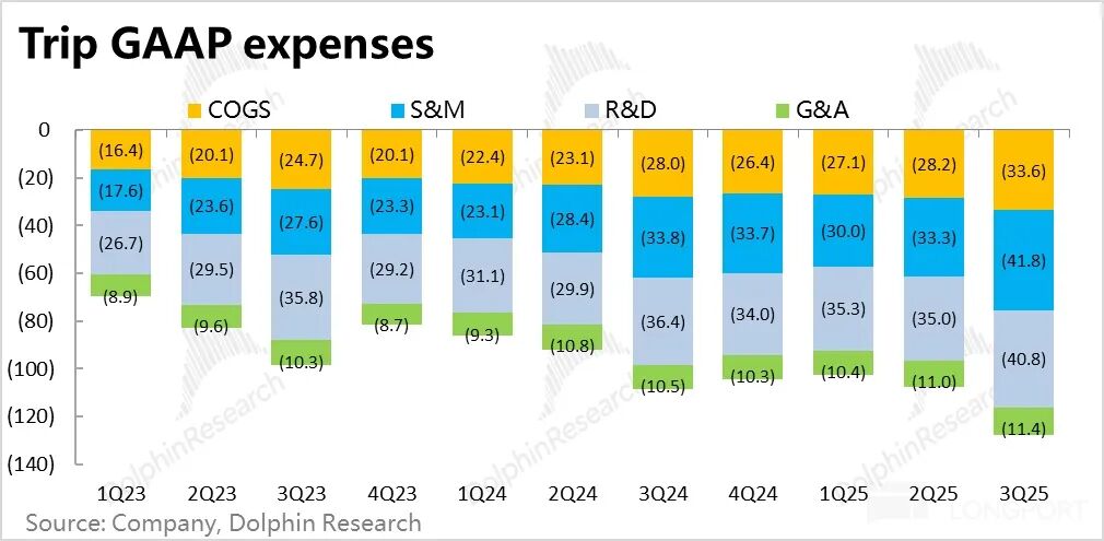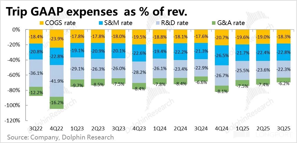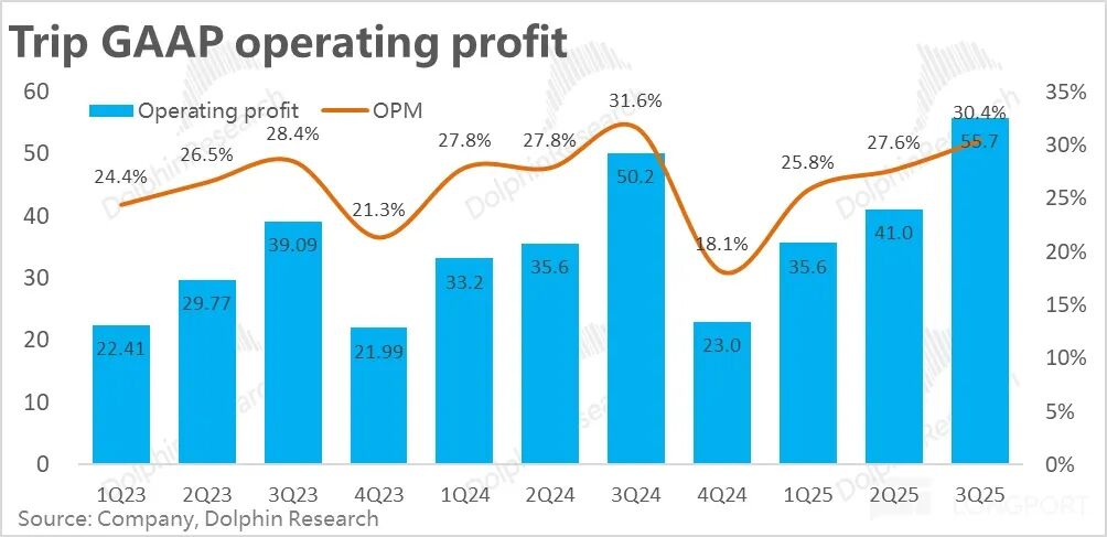 GAAP 口径下,由于毛利率处于收缩期,而费用支出则在扩张期,本季携程的GAAP 经营利润率同比收窄了 1.2pct,经营利润同比增长 11% 到 55.7 亿。