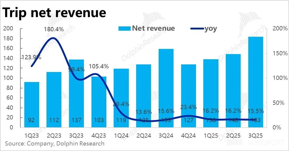 本季携程集团整体净收入约 183 亿元(剔除营业税),同比增长 15.4%,增速环比略有放缓、但仍稍高于市场预期的 14.5%,增长依然稳健。