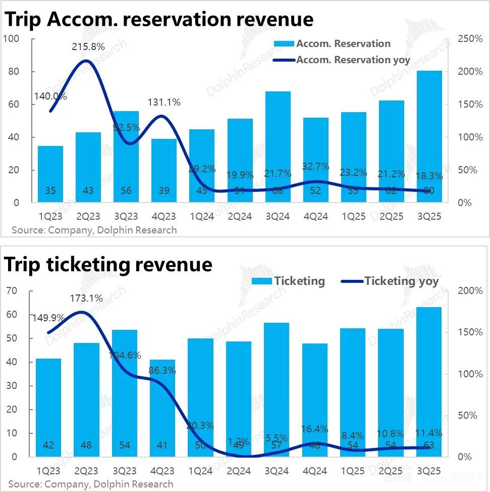 3、两大支柱业务中,本季度酒店 预定 营收同比增长了约 18%,环比继续降速 3pct,接近公司先前指引区间 14%~19% 的上端。除了因基数走高的影响外,国内外酒店客单价都仍有下行趋势,应该也是拖累原因之一。