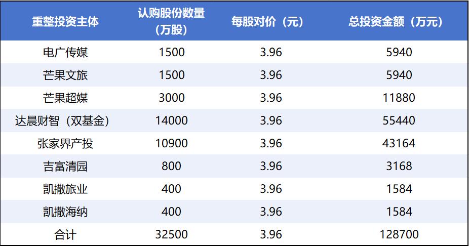 公告显示,张家界与电广传媒(000917.SZ)、芒果文旅、芒果超媒(300413.SZ)、达晨财智、张家界产投、吉富清园、凯撒旅业(000796.SZ)、凯撒海纳等投资人签署协议,上述投资人将以3.96元/股的对价,认购公司3.25亿股股份,总投资金额约12.87亿元。
