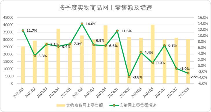今年前三季度,在补贴政策推动下,实物商品网上零售额整体增长6.5%,高于社会消费品零售总额增速。然而,增量主要集中在国家补贴发放的第一季度。