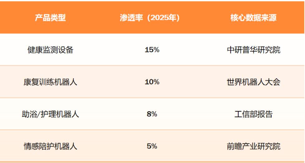 根据铅笔道研究院测算,2025年智能养老机器人的整体渗透率约为8%。具体来看,康复类养老机器人以45%市占率稳居第一,而情感陪伴类机器人年增速最快,达到了120%,每个细分赛道上都有众多的机会涌现。
