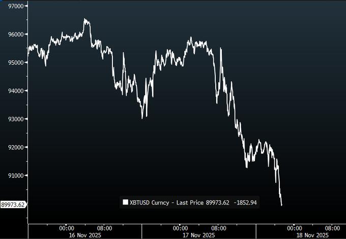 比特币价格周二亚洲时段跌破了9万美元大关,延续了近一个月来的下跌态势。过去六周内,加密货币市场已累计蒸发了逾万亿美元市值。科技股估值过高及美国利率路径的不确定性正持续引发投机资产抛售潮。