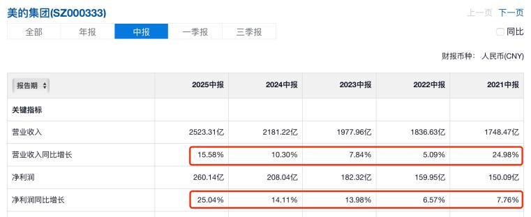 据悉,2021年-2025年,美的集团中报营业收入分别为1748.47亿元、1836.63亿元、1977.96亿元、2181.22亿元和2523.31亿元,分别同比增长24.98%、5.09%、7.84%、10.3%和15.58%;同期,其净利润分别为150.09亿元、159.95亿元、182.32亿元、208.04亿元和260.14亿元,同比增长分别为7.76%、6.57%、13.98%、14.11%和25.04%。