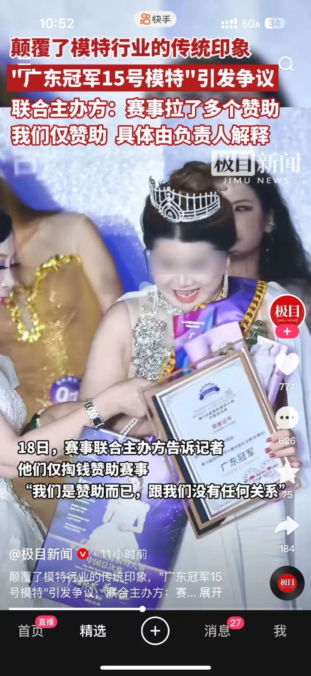 11月16日在深圳举办的“国际模特大赛”15号选手夺冠,比赛相关图片和视频流出后,同样受到广泛质疑。媒体说,她的夺冠“颠覆了”大众对模特行业的传统印象。”网友发出疑问“她是如何获得冠军头衔的?”