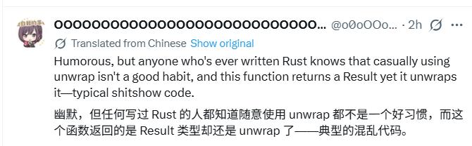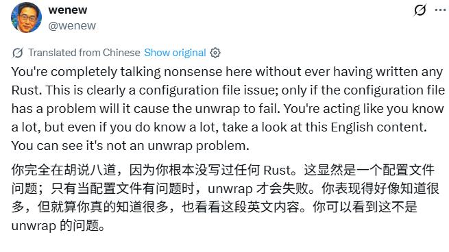 “一行 Rust 代码崩溃,导致全球一半的流量瘫痪。”不少人认为,写过 Rust 的都知道随意使用 unwrap 都不是一个好习惯。也有人指出,“只有当配置文件有问题时,unwrap 才会失败。”