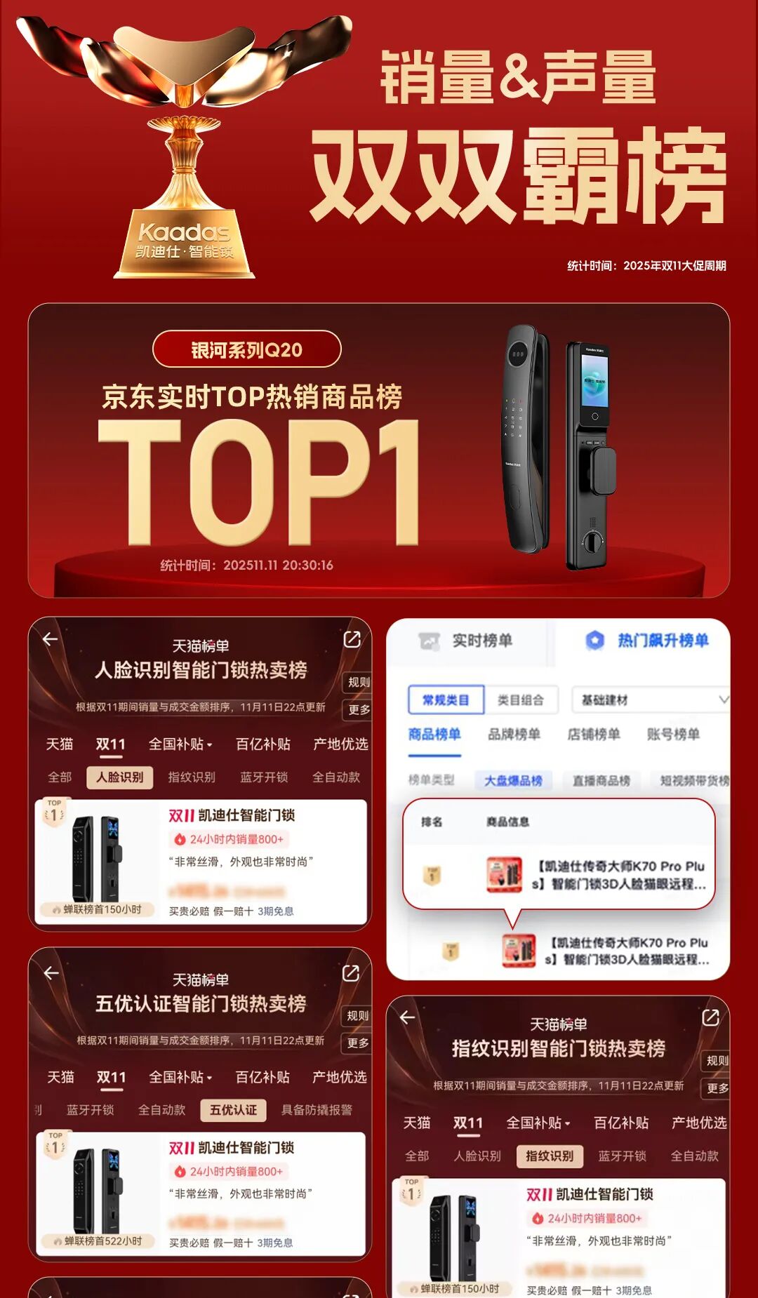 2025年双11大促收官,智能锁行业领军品牌Kaadas凯迪仕交出了一份亮眼成绩单,强势登陆各大榜单,销量与声量双双霸榜,全网声量破50亿,内容营销与事件营销双双破圈。其中金刚系列P30在天猫平台跻身十大类目热卖榜第一,银河系列Q20登上京东实时热销商品榜榜首。