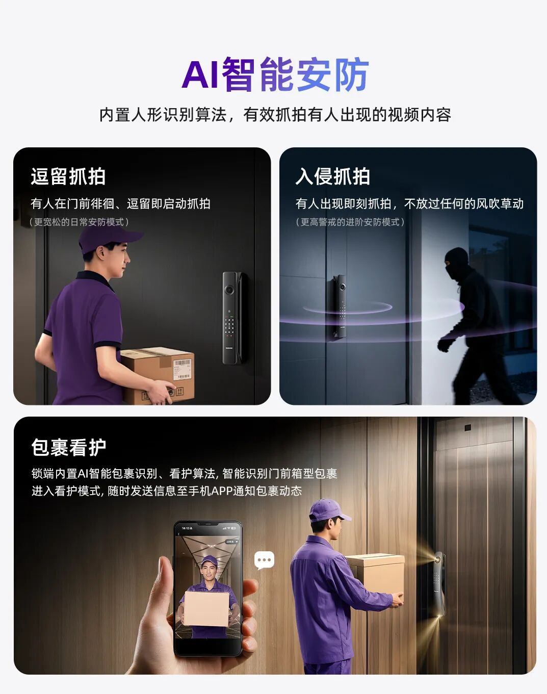 在设备端,内置的AI芯片让门锁能对撬锁等显性威胁做出毫秒级识别,并就地发出声光警报,不依赖网络,第一时间阻断风险。而在云端,系统能通过对门前画面的持续学习,辨识更复杂的行为意图——比如人员异常徘徊、区域入侵,甚至实现“包裹看护”:自动识别快递并被异常取走时,及时通知用户。