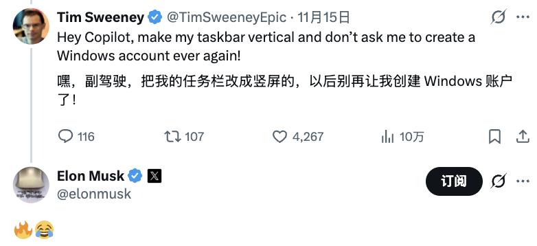 怒批Win11,马斯克、Epic CEO接连下场吐槽:把我的任务栏竖起来,别再逼我登录微软账户...
