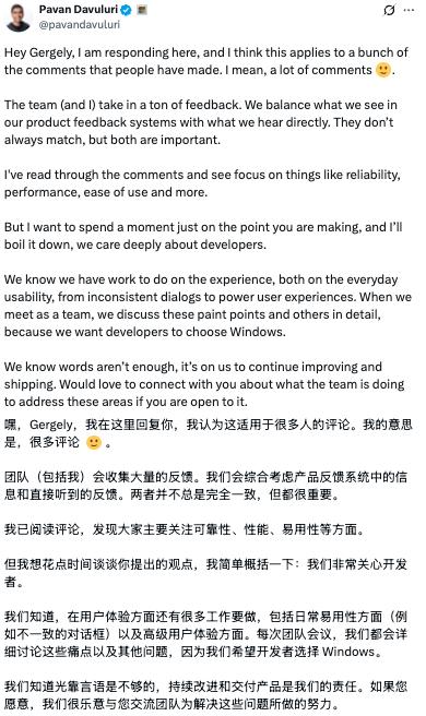 面对诸多的批评,Windows 部门负责人 Pavan Davuluri 在回复用户评论时写道:“团队(包括我)会收集大量的反馈。我们会权衡产品反馈系统中的信息和直接听到的反馈。我们知道还有很多工作要做....我们知道光靠言语是不够的,持续改进和交付产品是我们的责任。”