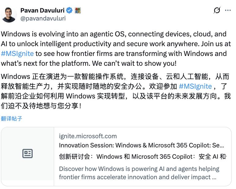 最近,微软在持续推进自家 Copilot 的落地,其不仅在社交平台大肆投入广告宣传,而且也在加快研发进度,最新带来 Copilot Actions 等新功能。甚至就连微软 Windows 部门负责人 Pavan Davuluri 都直言:Windows 正在演变为“一款智能体操作系统(Agentic OS)”,连接设备、云和人工智能。