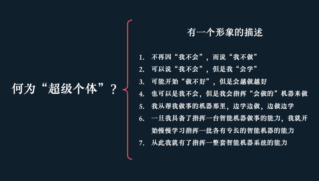 但大家都知道,组织是由个体构成的,所以虽然前沿组织是愿景,我们真正关心的还是超级个体。从个体演进来看,我们会从人机配合,驾驭机器。