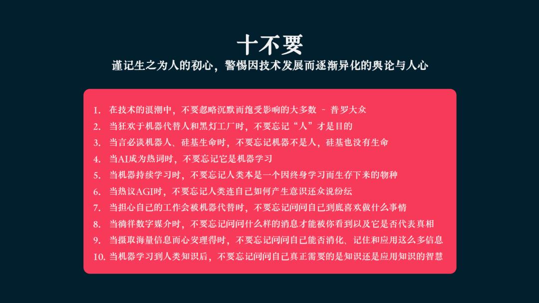 我讲的所有内容,对于人工智能这个大话题,如果放到系统论的观点来看,绝对是管中窥豹,它不过是人类文明下一步的探讨。任何自以为有什么新的观点或意见,我们最好相信是在画蛇添足。