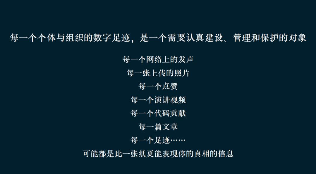 这才是信息文明的表象。它对每一个个体和组织提出了一个非常高的要求:你的数字足迹,必须是一个主动的建设、主动的管理和主动的保护的对象。