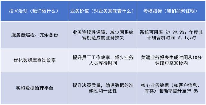 比如通常情况下对于信息部门而言系统故障率一般只会写:“系统故障快速修复,不超过2小时”,如此看起来描述看似明确,但实则过于简单即使完成也难以获得认可,并未体现价值。因此建议信息部门建立一个《技术活动-业务价值映射表》,如下: