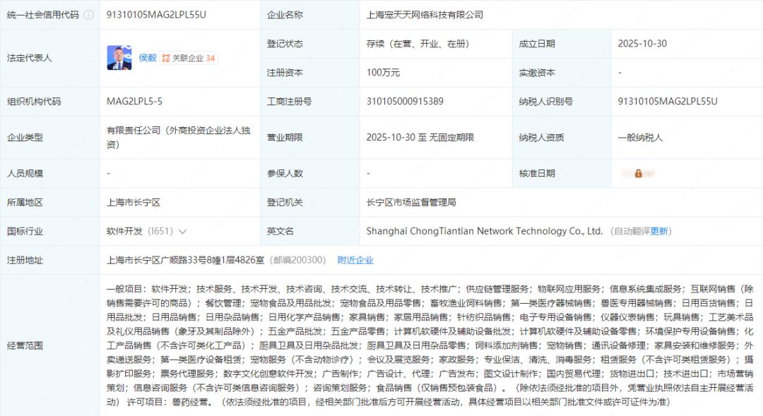 企查查信息显示,今年10月,上海宠天天网络科技有限公司正式成立,由侯毅担任法定代表人,上海派特鲜生网络科技有限公司全资持股,经营范围包括互联网销售、宠物食品及用品批发、宠物食品及用品零售等。同时,派特鲜生申请的“宠天天FresDD”商标也正在注册申请中。