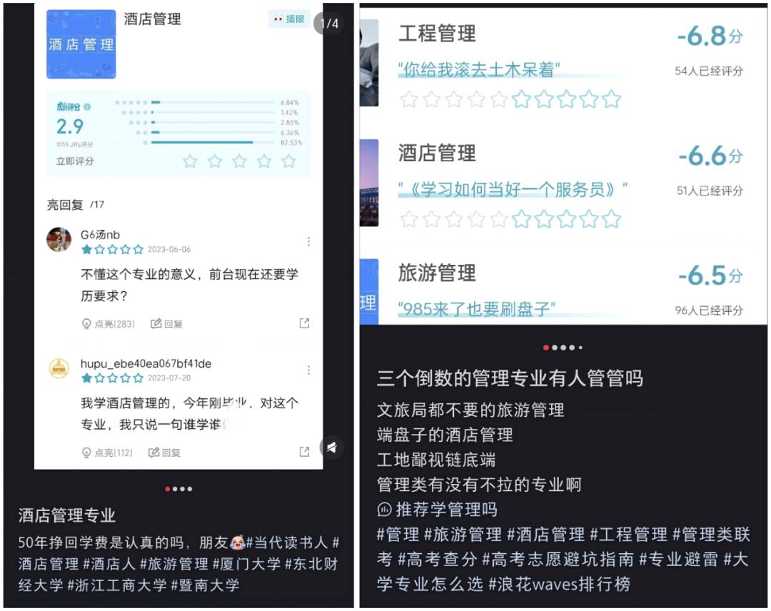 社交媒体上充斥着对旅游和酒店管理专业的“劝退”建议。网友普遍认为这些专业“没有门槛”,毕业了转行哭都来不及。