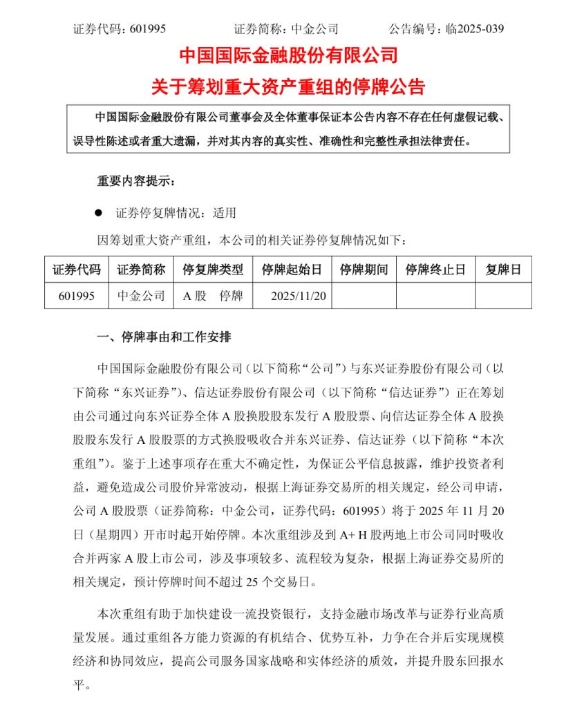 自11月20日开市时起,中金公司、东兴证券、信达证券将停牌,预计停牌时间不超过25个交易日。