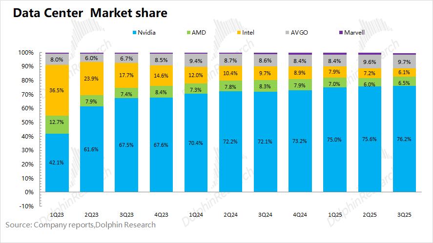 另一方面,当前AI芯片市场的核心玩家是英伟达、博通和AMD,这三家基本占据了市场90%以上的份额。英伟达在当前市场中仍处于绝对龙头地位,但博通和AMD凭借价格优势仍在持续追赶。
