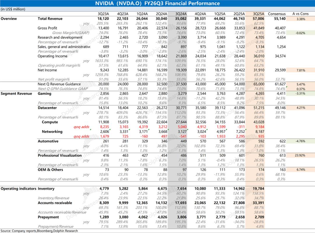 英伟达 (NVDA.O)北京时间11月20日凌晨,美股盘后发布2026财年第三季度财报(截至 2025年10月),具体内容如下: