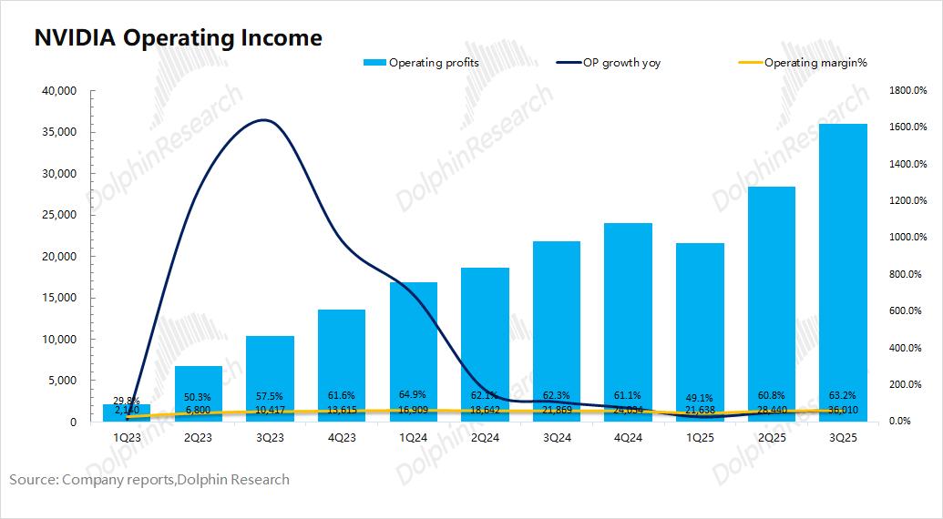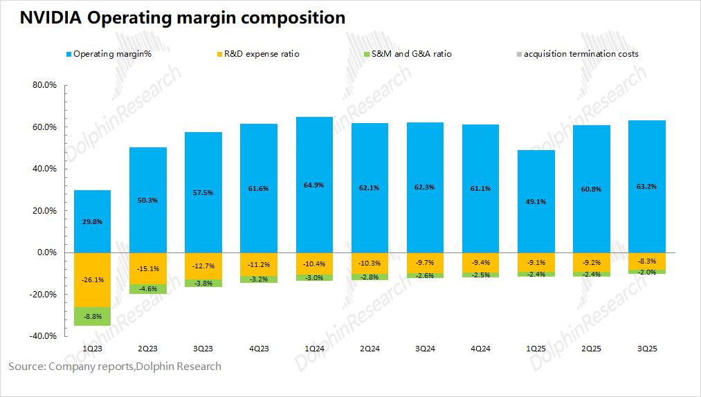 2026财年第三季度英伟达核心经营利润率为63.2%,继续提升,主要是受毛利率回升以及经营费用率下降的影响。