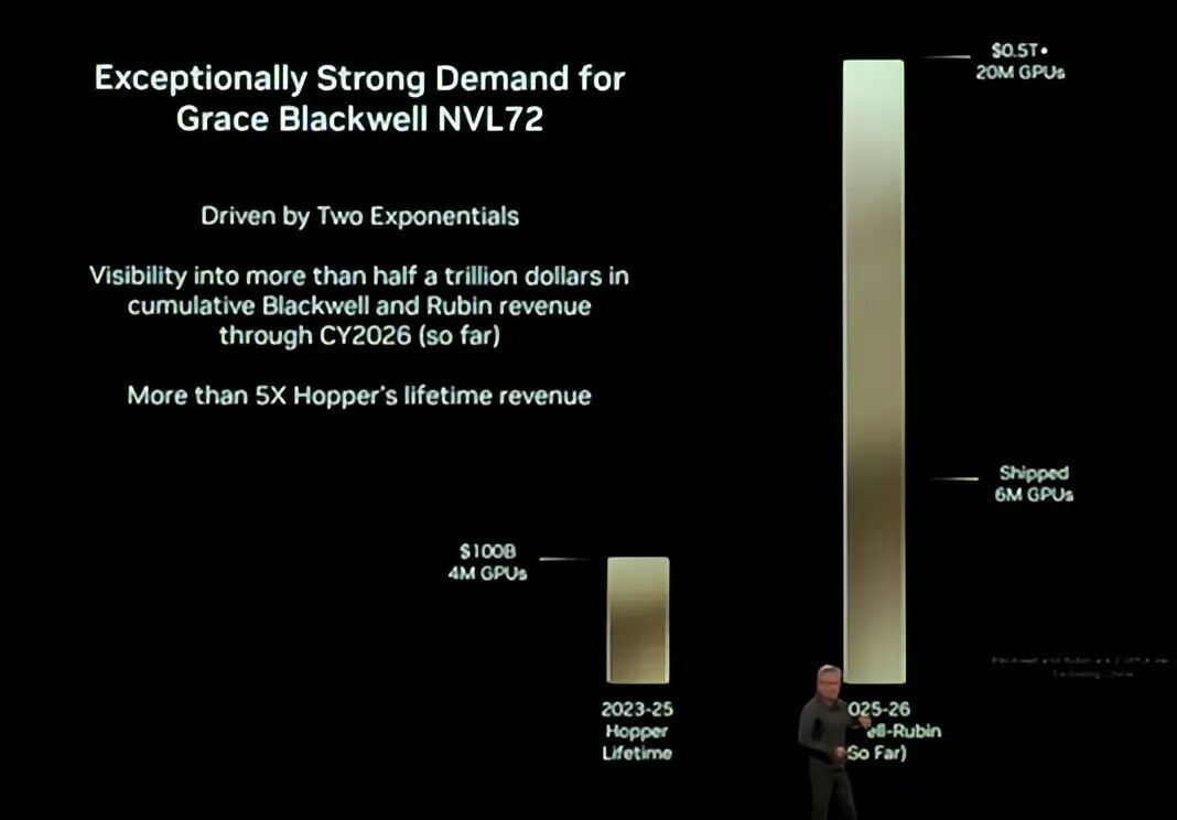 由于公司曾在此前的GTC大会上披露了AI业务的展望,预计Blackwell+Rubin至2026年底累计达到2000万颗的出货指引(大致对应5000亿美元的收入)。