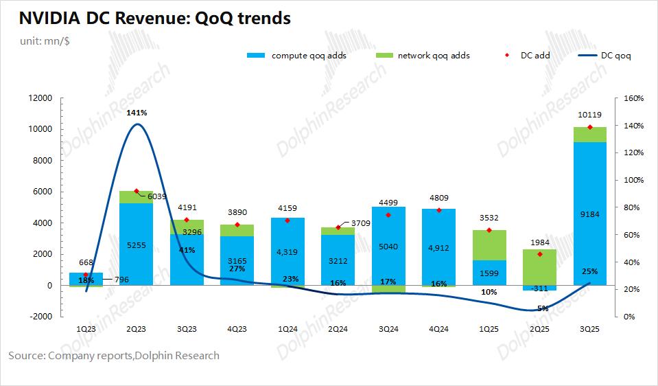 具体来看:①计算业务收入本季度为430亿美元,环比增加92亿美元,其中B300在本季度的加速量产贡献了最主要的增量;②网络业务收入本季度为82亿美元,环比增长9亿美元。