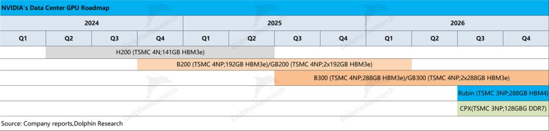 英伟达计划在2026年下半年推出Rubin和CPX产品,届时将开始采用台积电3nm工艺,在2027年将继续推出Rubin Ultra产品。同时值得关注本次财报后,公司管理层给出的新产品进展信息。