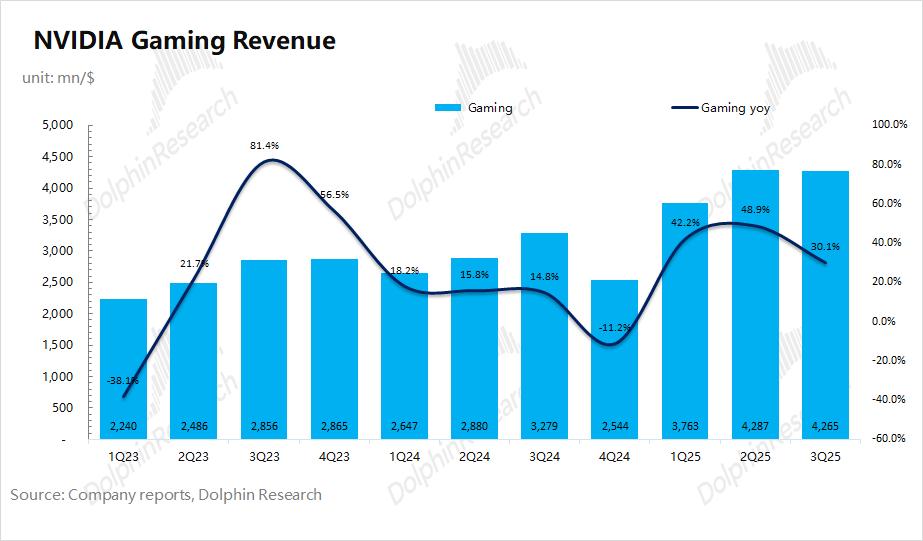 3.2游戏业务:2026财年第三季度英伟达游戏业务实现营收42.6亿美元,同比增长30%,主要是受公司RTX50等系列产品的出货带动。游戏业务在公司整体收入中占比已经不足一成,公司当前业绩重心依然是数据重心业务。