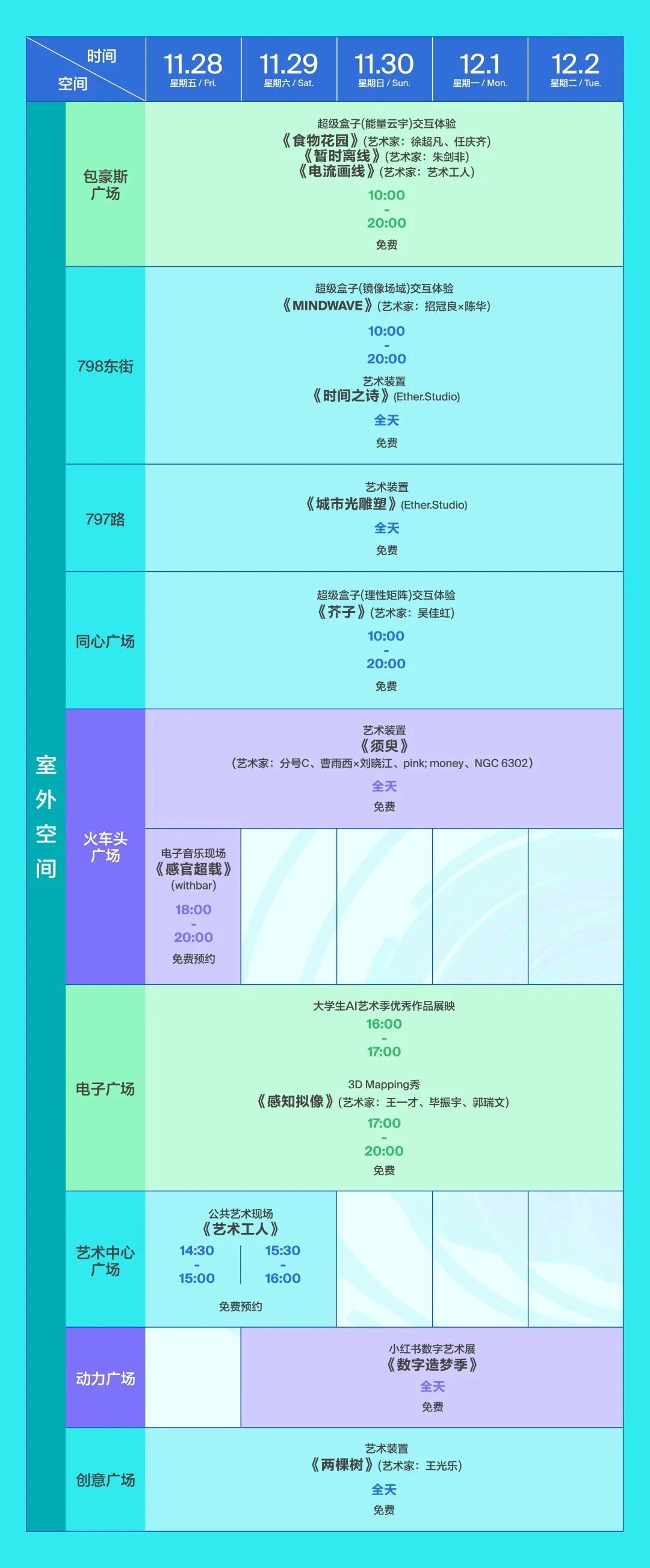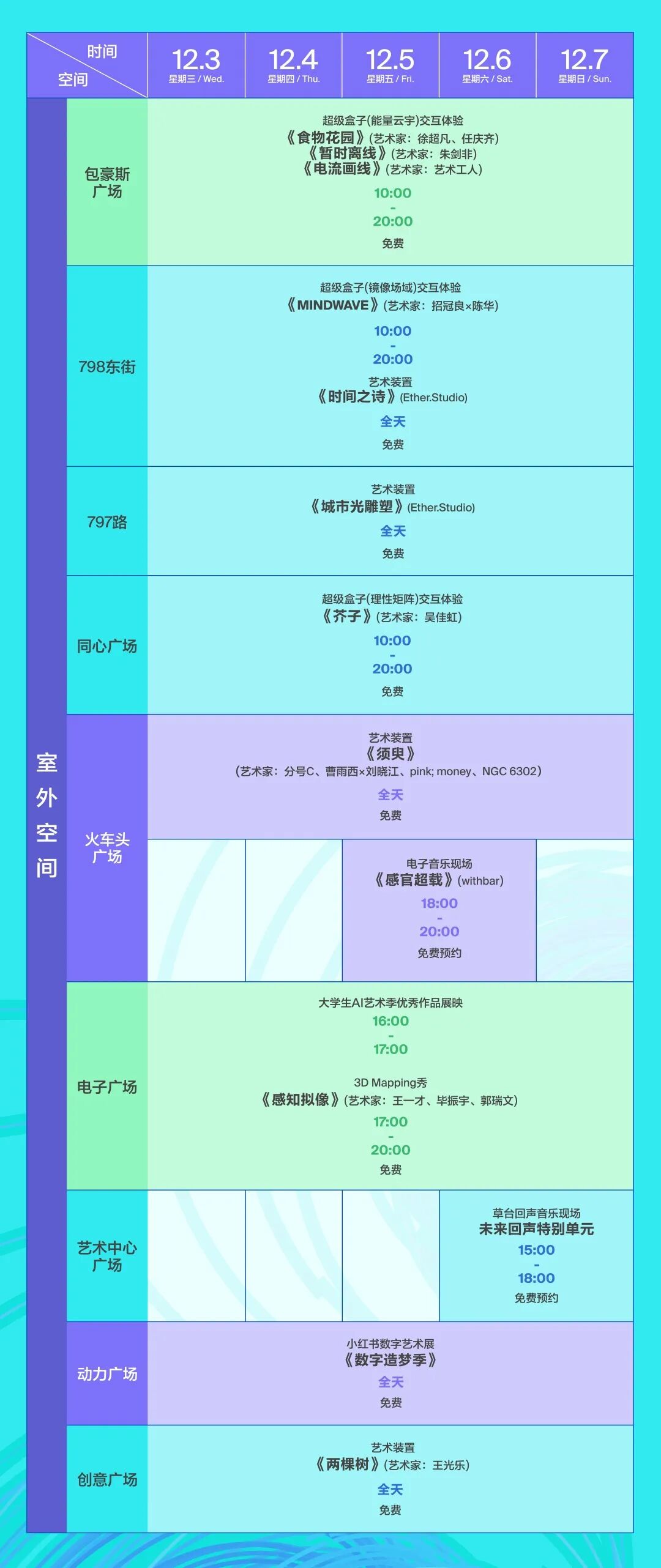我们携手草台回声、小红书和王光乐、艺术工人等艺术家们,把快闪音乐现场和互动艺术装置填满9个户外公共空间。在超级盒子里体验有趣的科技艺术装置;在火车头广场的魔幻光圈下伴随音乐摇摆;在艺术中心广场接受AI BOSS的算法指挥,感受巨型 3D Mapping的超级震撼。
