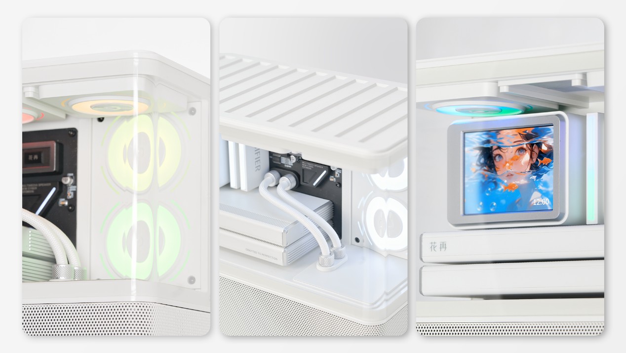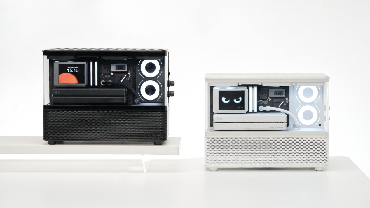 借鉴海景房机箱的设计灵感,将通透流动的视觉美学融入音箱设计,打破传统音箱形态边界,再造声学新物种,以可视化音箱系统、动态光效、趣味交互,解锁声光全新体验。产品采用极光白、幻夜黑经典双色,百搭桌面场景。