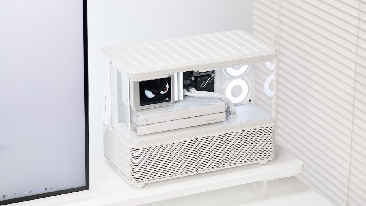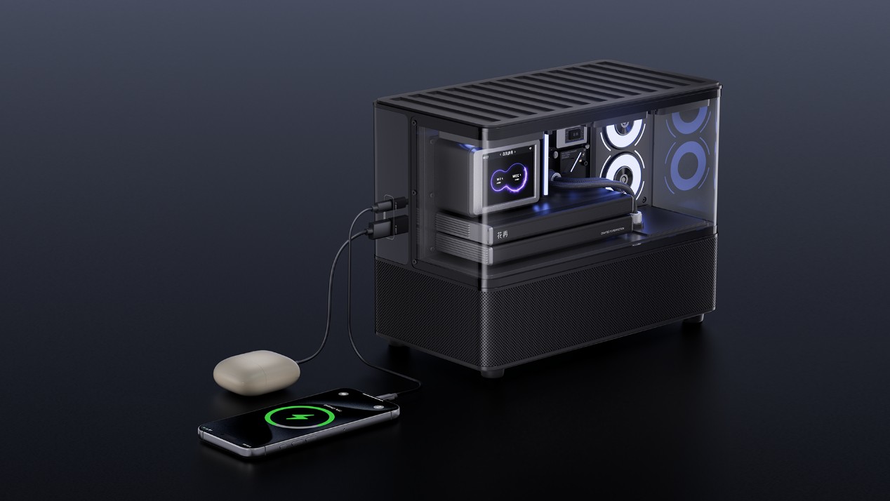 具体而言,NEW CYBER采用了一种前所未有的产品设计逻辑:它看上去像一台迷你海景房主机,拥有双曲面高透亚克力侧透展示效果。同时采用上下分区结构,下方声学区域与上方三面透明的硬件区形成视觉对比,内部电源管理模块、信号处理器等组件直观可见,配合拟物风扇氛围灯,将硬件本身打造成视觉焦点。