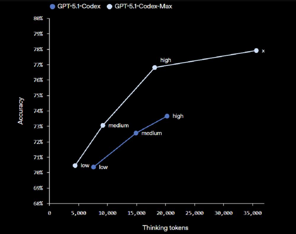 推理效率上,GPT‑5.1‑Codex‑Max在中等推理强度下完成任务时,所使用的思考token比GPT‑5.1‑Codex少约30%,但仍能取得更高准确性。