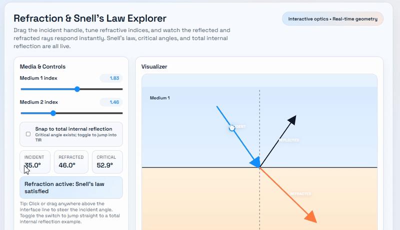 GPT-5.1-Codex-Max打造的下一个案例,可帮助用户直观、动态的方式理解光在两种介质界面上的折射规律——斯涅尔定律(Snell’s Law)。