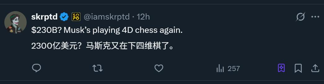 2300亿,这个数字比马斯克今年3月披露的1130亿美元估值(xAI与X合并后估值),翻了一倍不止。