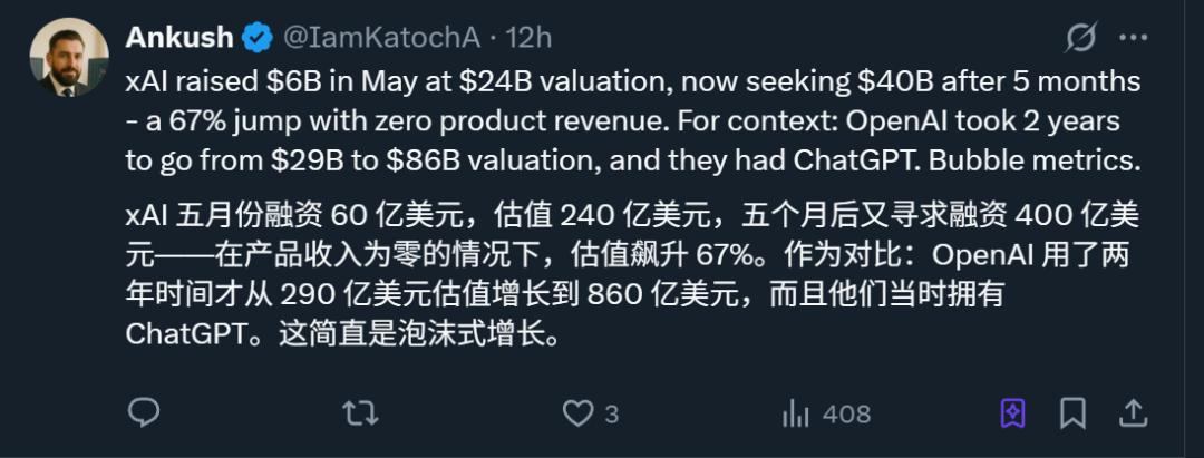 甚至,对比起OpenAI这样的增长怪兽,xAI的估值飙升速度也是让人咂舌。