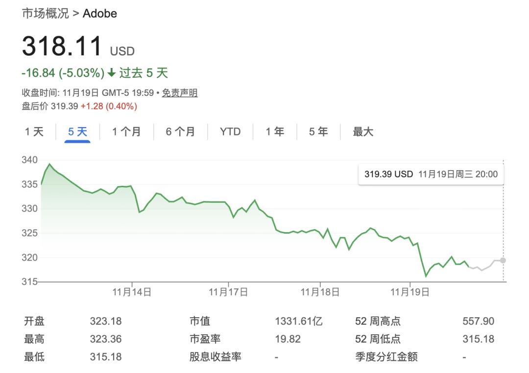 Adobe股价则下跌5%。11月19日收盘,Adobe股价为318.11美元(约合人民币约2264元)/股,市值为1331.61亿美元(约合人民币约9478亿元)。