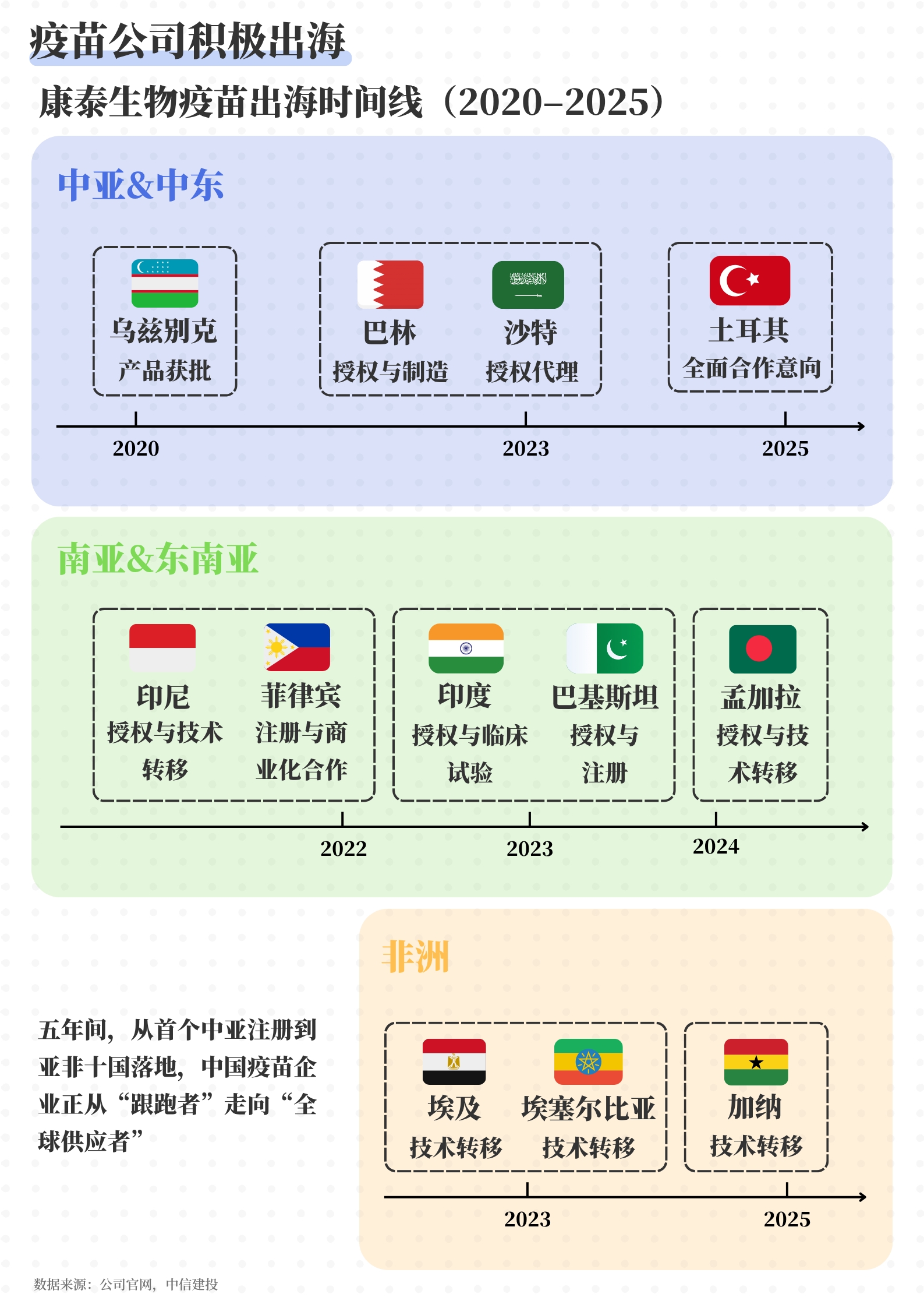 在国内市场竞争加剧的背景下,疫苗企业正加速出海。以康泰生物为例,其23价肺炎疫苗2020年在乌兹别克斯坦取得注册证书后,业务已拓展至亚非多国,海外市场正成为新的增长引擎。