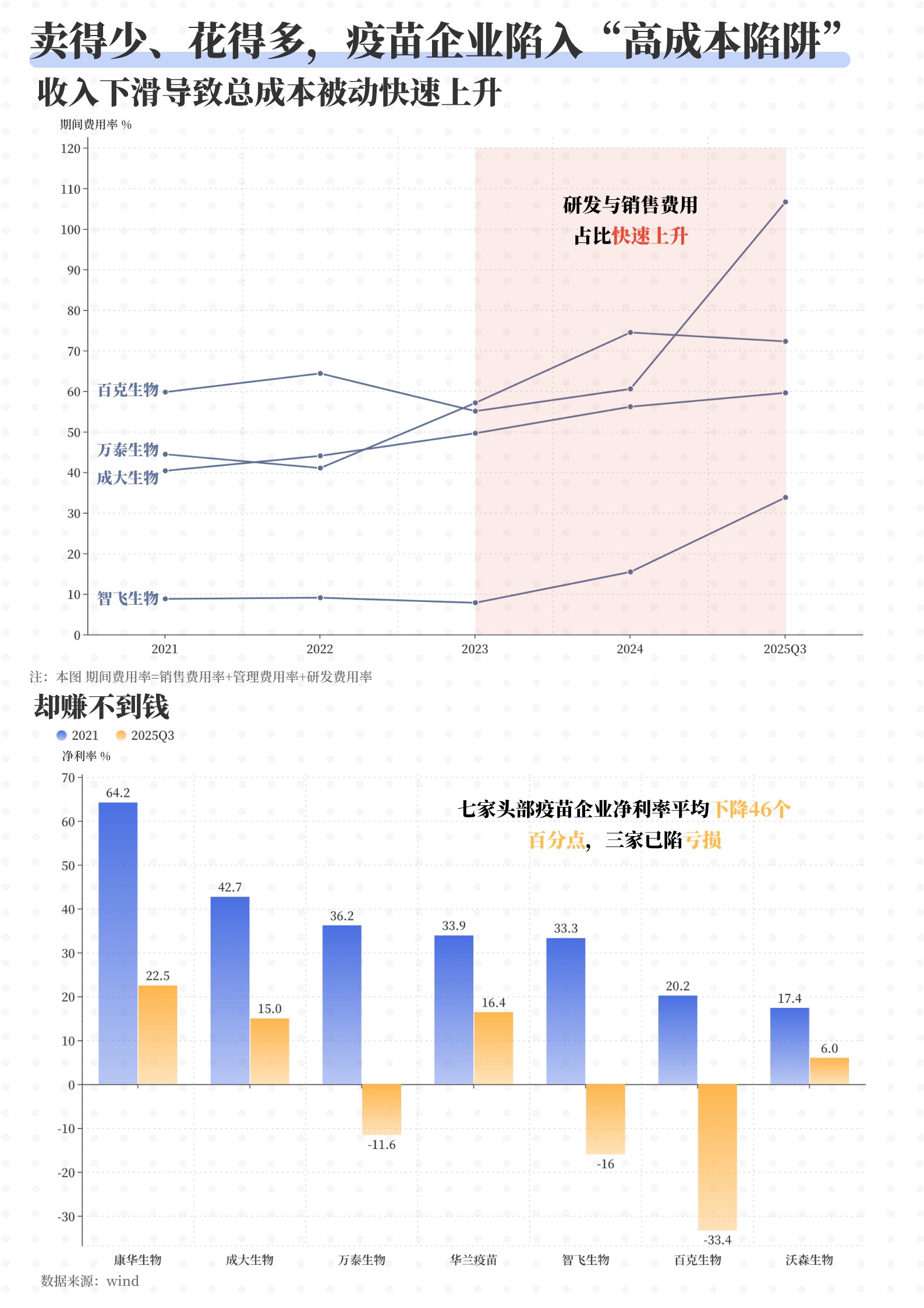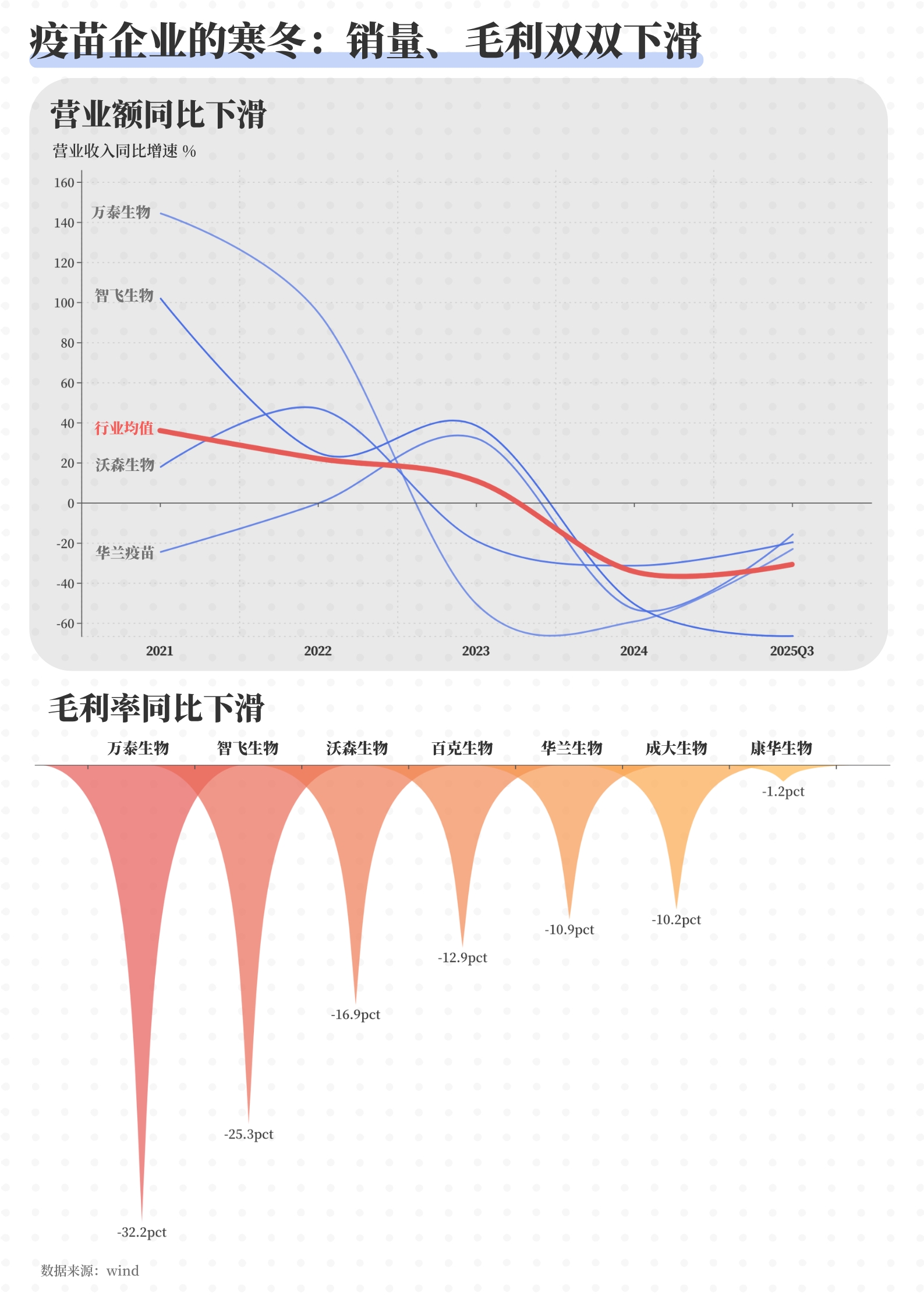 需求疲软与价格下行叠加,使企业盈利能力持续承压。数据显示,七家头部疫苗企业净利率平均下降约46个百分点,其中三家已出现亏损。