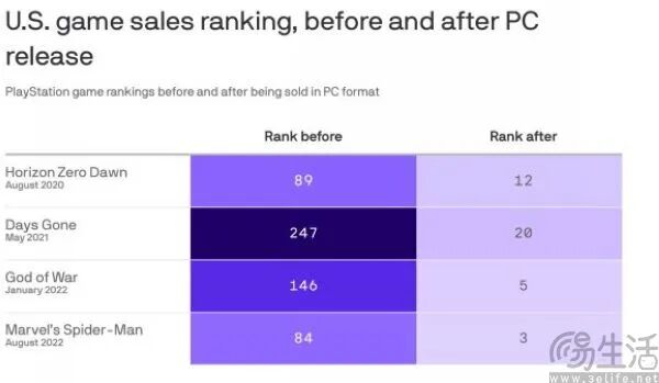 比如,《战神》、《往日不再》在2022年登陆PC后就收获了一大批新玩家,其中《战神》在美国的销量排名就从第146一路跃升至第5名,《往日不再》也从247名直升至第20名。