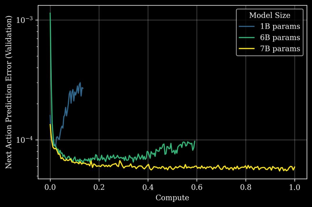 Generalist的规模化实验表明,GEN-0模型必须足够大,才能吸收海量的物理交互数据。